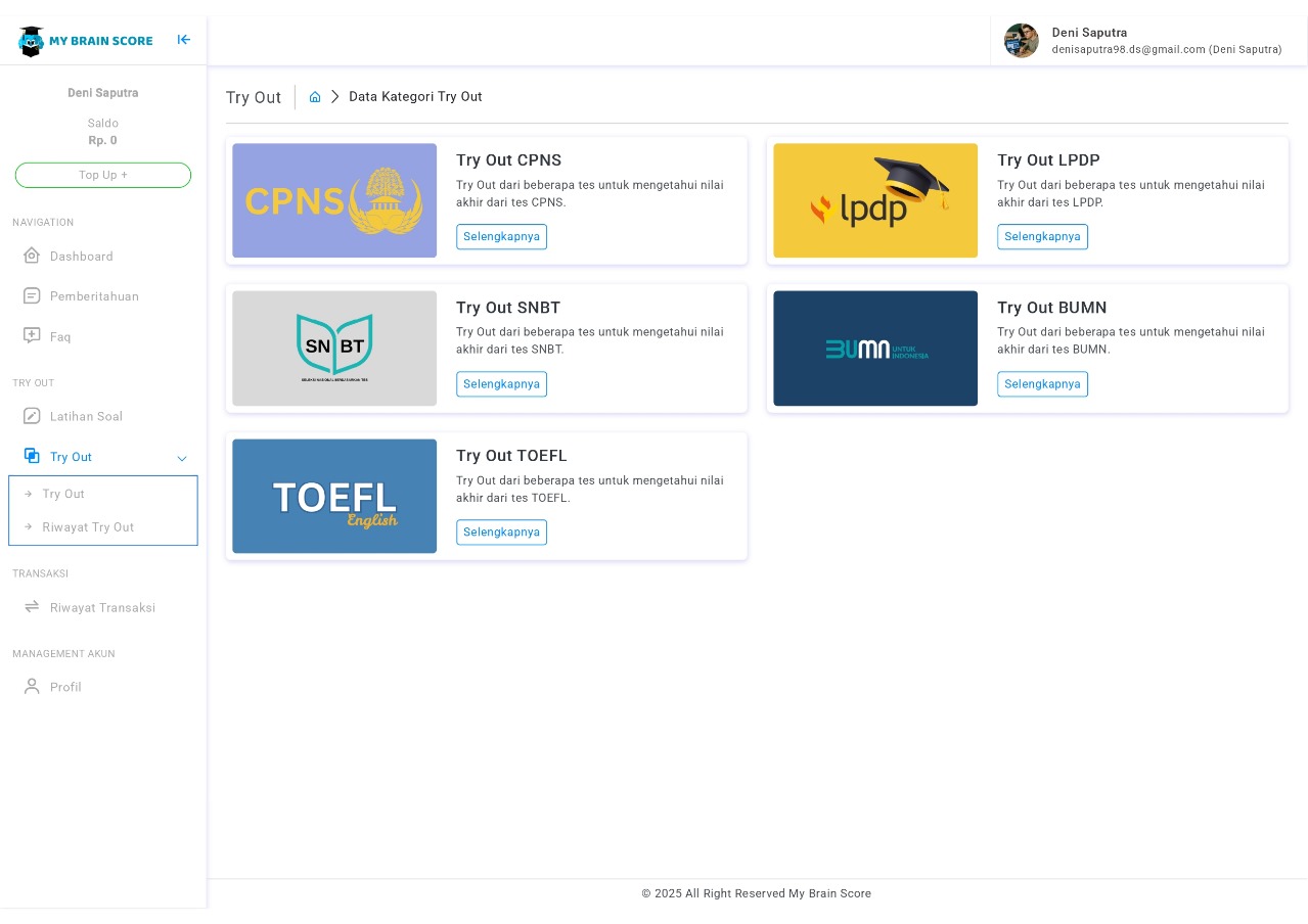 mybrainscore merupakan sistem CAT dibuat khusus untuk kamu akan mengikuti tes CPNS. dibuat semirip mungkin dapat digunakan melalui Handphone atau Komputer untuk merasakan sensasi soal-soal Try Out CPNS dan soal Skolastik Indonesia. sehingga anda tetap fokus dan menghindari dari masalah teknis yang tidak diinginkan